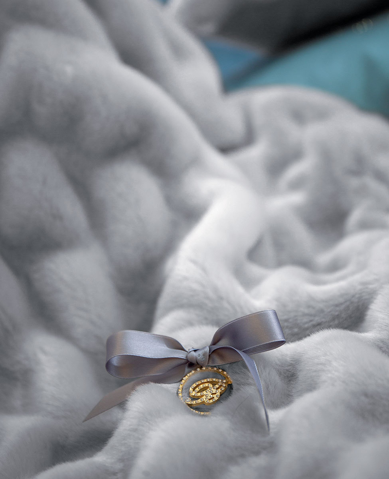 غطاء سرير مزدوج دافئ وناعم جدًا من الفرو الصناعي مع قلادة بلومارين من الكريستال.