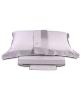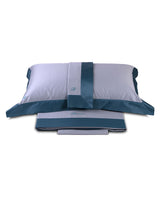 Juego completo de sábanas matrimoniales en satén de algodón liso con franjas en color contrastante aplicadas y logo bordado en la sábana superior y fundas de almohada.
